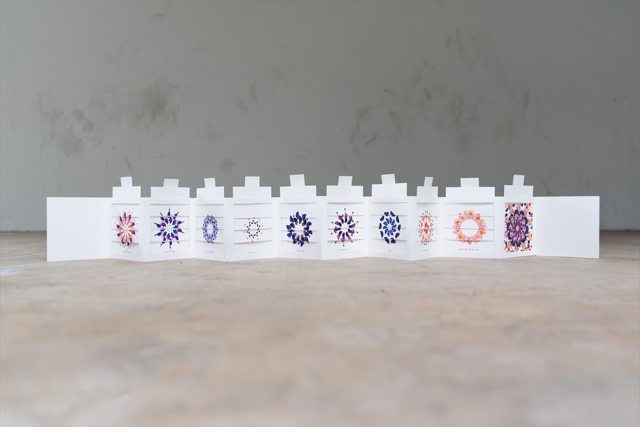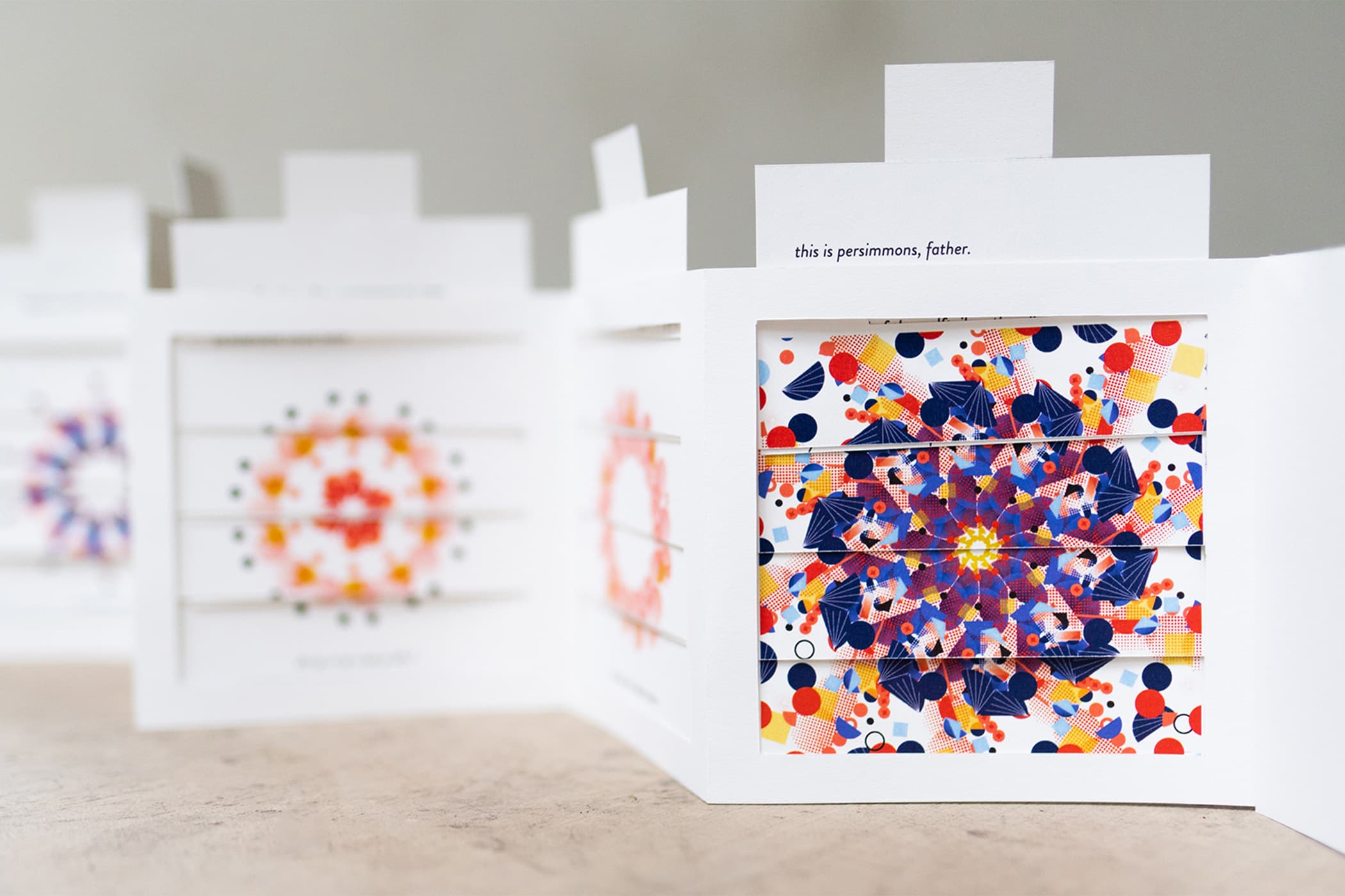 Persimmons is an interactive book translating a poem into art through linguistic analysis and code. Words taken from each passage of Li-Young Lee’s poem, “Persimmons”, are run through Processing; the reader’s interaction with the book transforms the text’s phonetic structures into generated patterns.